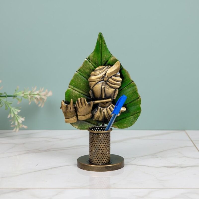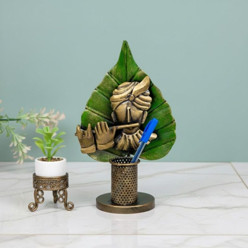 Furnshine – Prescott Krishna Leaf Pen Holder – Handcrafted Spiritual Desk Organizer, Artistic Flute Design for Office & Home