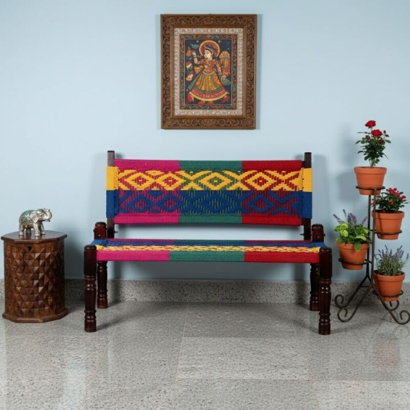 Furnshine – Edina Solid Wood Handwoven Backrest Bench (Multicolor)