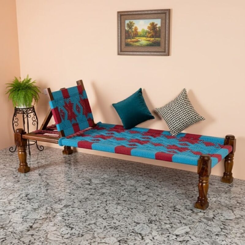 Furnshine – Locke Solid Sheesham Wood Handwoven Charpai with Backrest (Blue & Red)