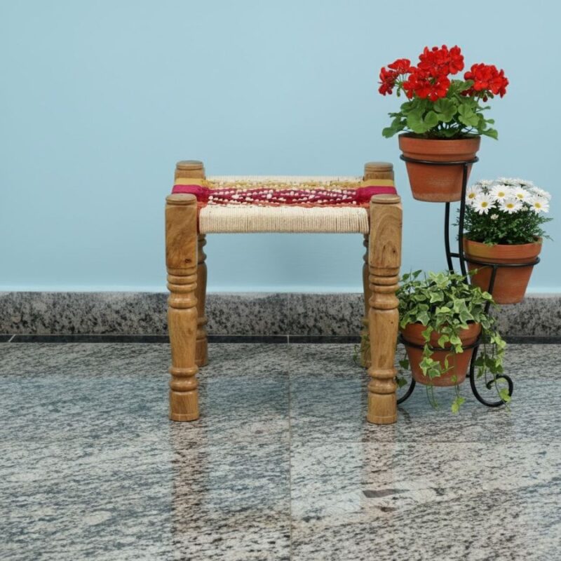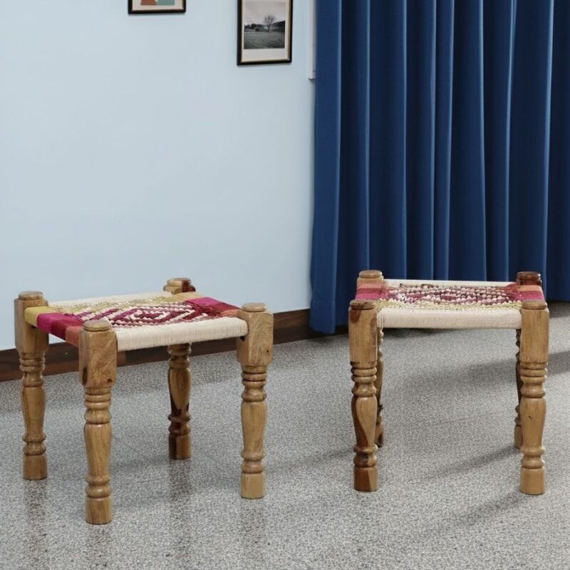 Furnshine – Rodney Sheesham Wood Multicolor Woven Seating Stool Pidha (Set of 2)