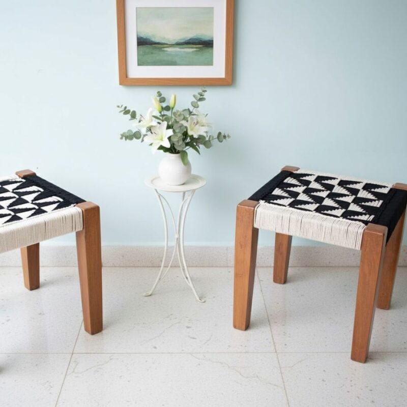 Furnshine – Royston Solid Sheesham Wood Black & White Handwoven Stool