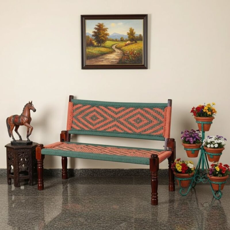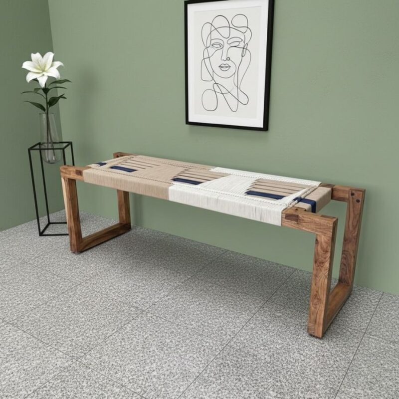 Funrshine – Ansley Handwoven Sheesham Wood Bench (Green & White)