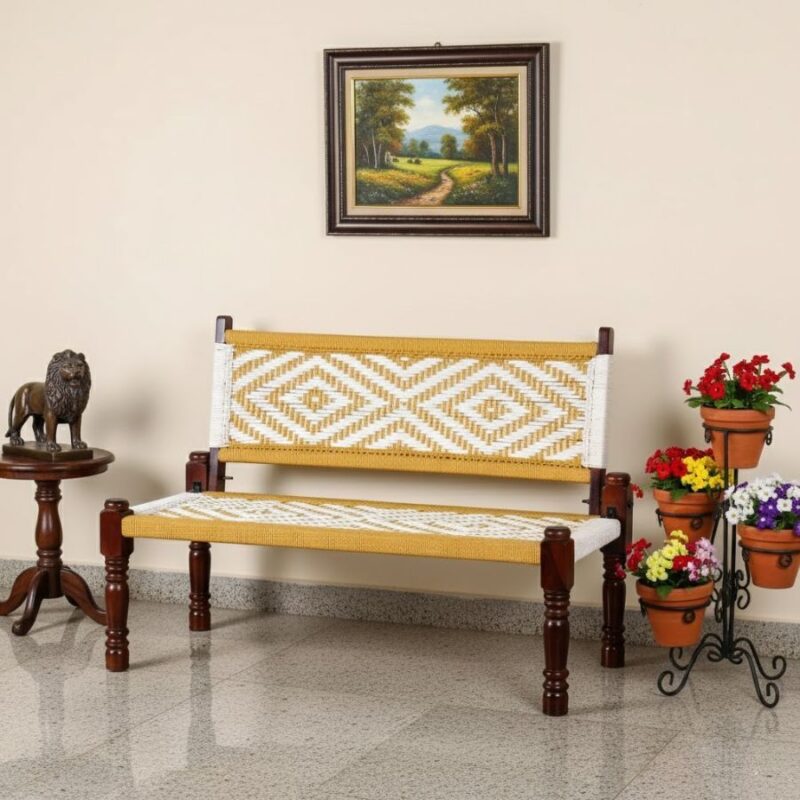 Furnshine – Stark Solid Sheesham Wood Handwoven Backrest Bench (Yellow & White)