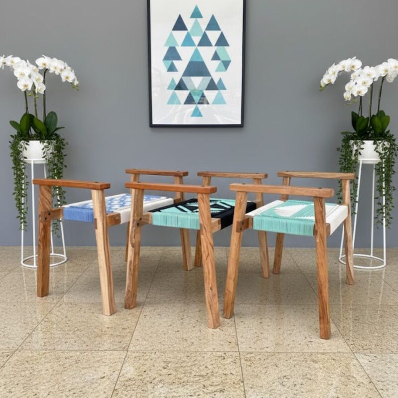 Handwoven dual-color seat with geometric motif.