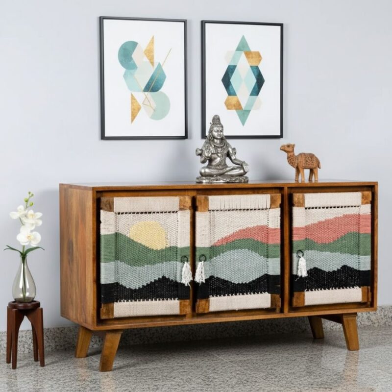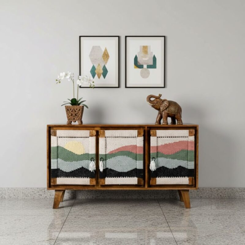 Furnshine – Ogden Three Door Solid Wood Handwoven Sunset Art Design Sideboard Cabinet (Teak Finish)