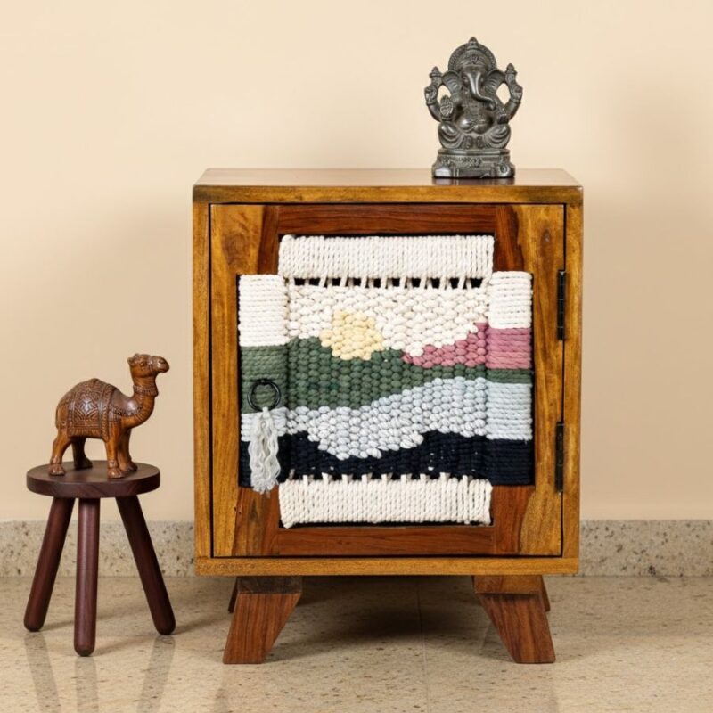 Furnshine – Ebba Single Door Solid Wood Handwoven Sunset Art Design Sideboard Table (Teak Finish)