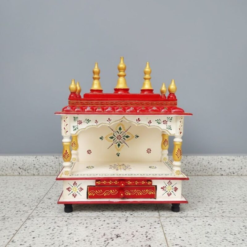 Handcrafted wooden mandir with traditional Rajasthani-style painting in red, white and gold.