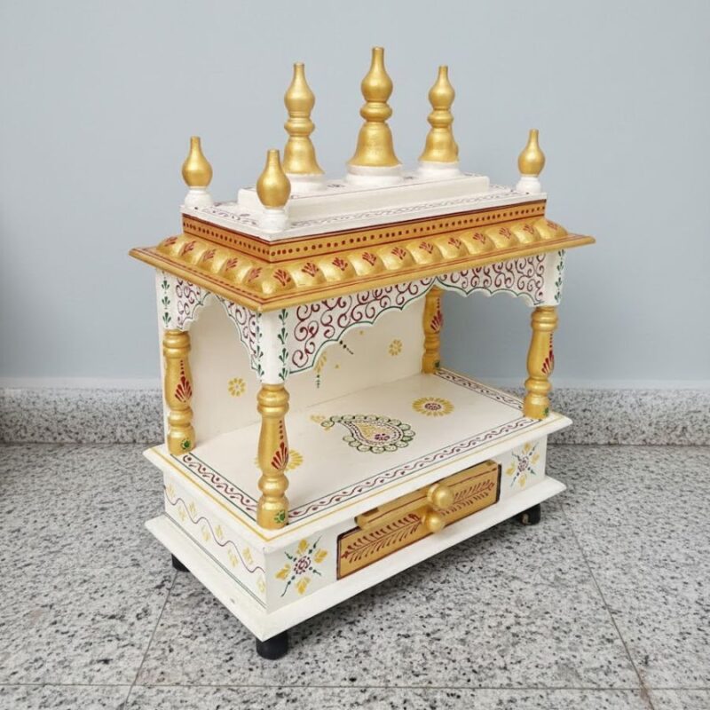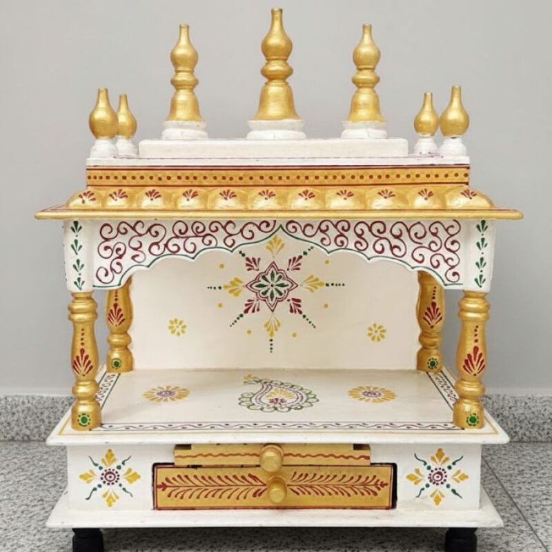 Furnshine – Handcrafted Wooden Pooja Mandir for Home | White & Gold Traditional Temple with Kalash Dome and Storage Drawer