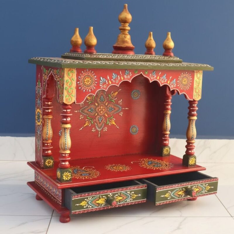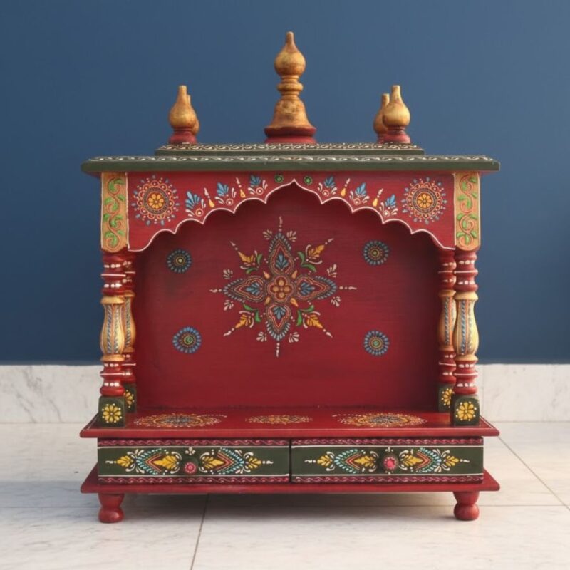 - Handcrafted wooden pooja mandir in rich red with green and multicolor detailing.