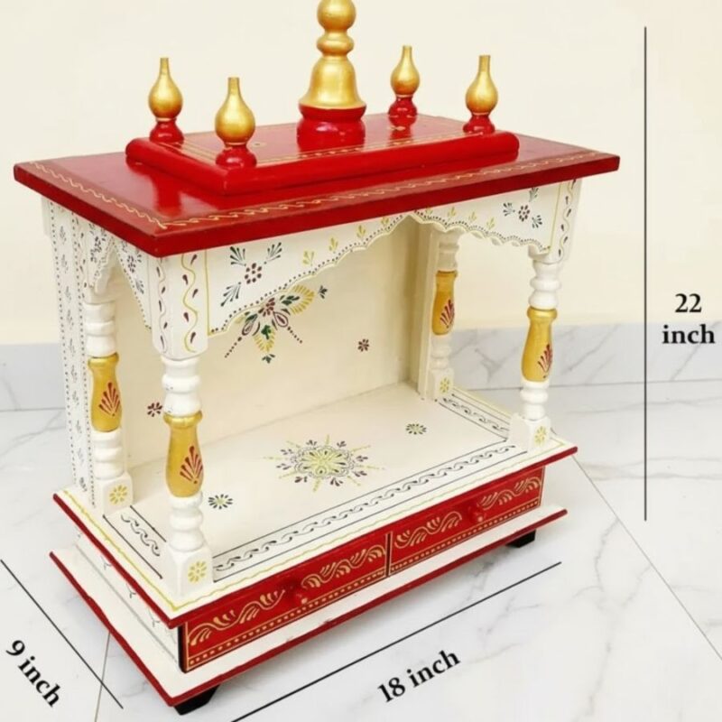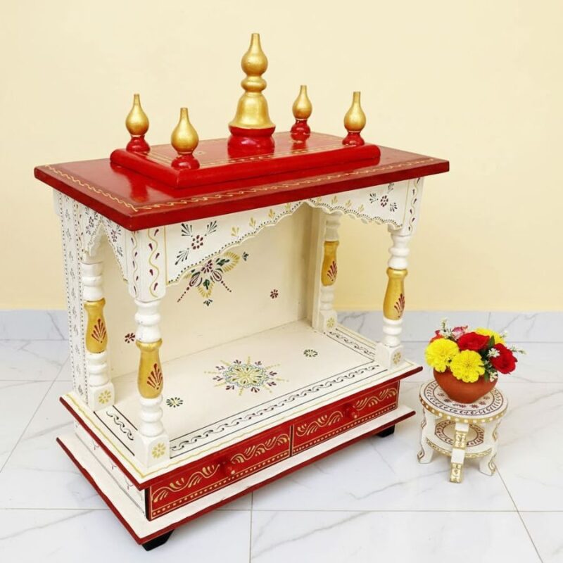 Furnshine – Wooden Temple Mandir for Home | Handcrafted White, Red & Gold Pooja Mandap with Drawers