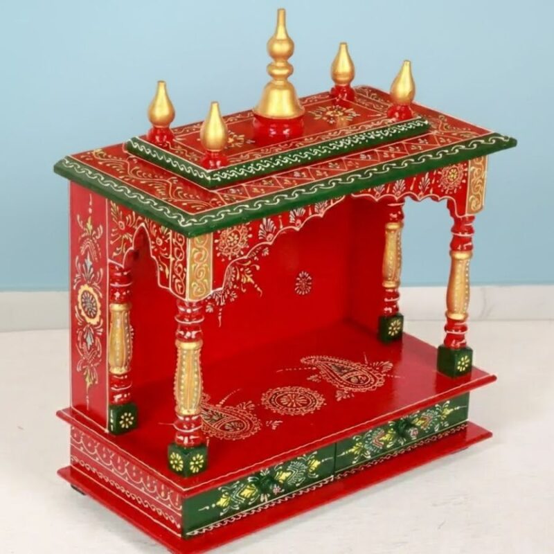 Furnshine – Red Green Wooden Temple with Drawers for Home Pooja Mandir Décor