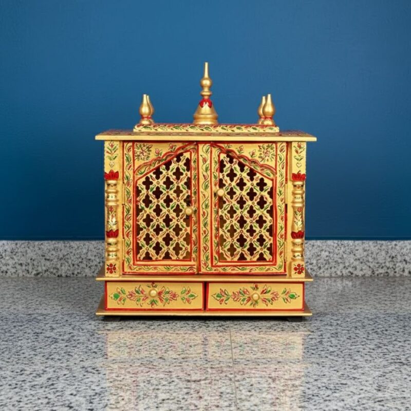Furnshine – Hand Painted Wall Mounted Golden Solid Wood Home Temple with LED | Floral Jali Doors Pooja Mandir with Twin Drawers for Home/Office Puja Room