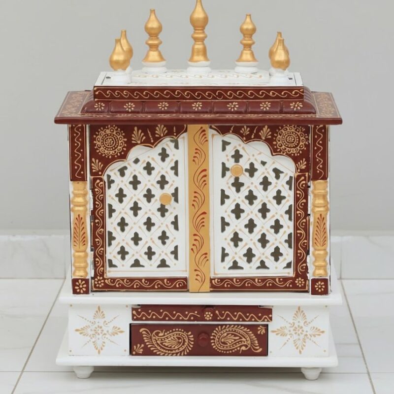 Furnshine – Handcrafted Wooden Pooja Mandir for Home | White, Maroon & Golden Temple with Jaali Doors & Storage Drawer