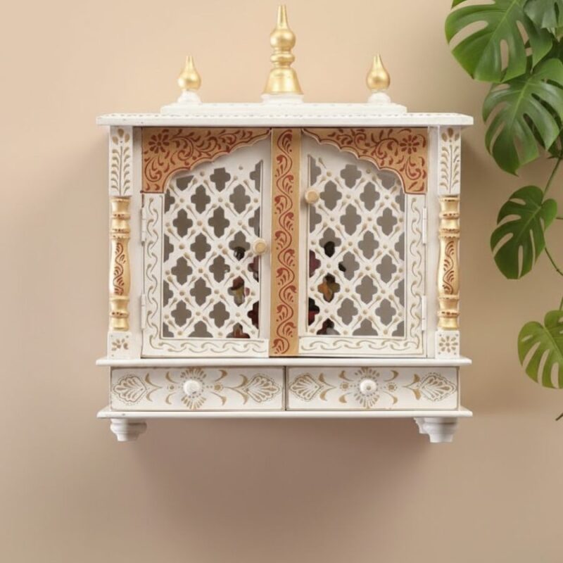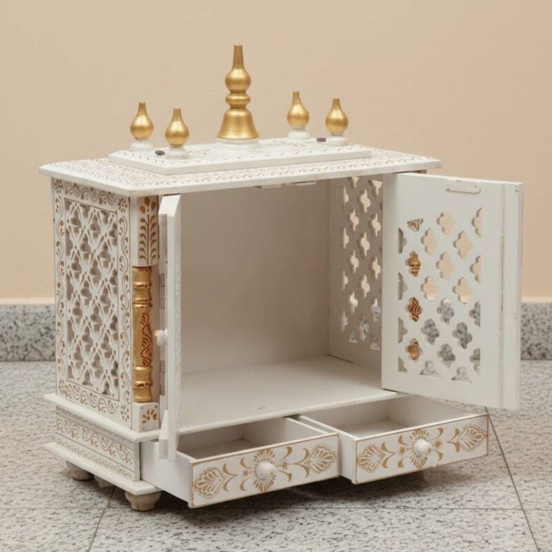 Handcrafted wooden pooja mandir in white and gold with ornate cutwork design.