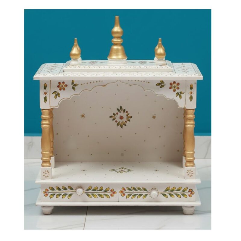 Furnshine – Natural Wooden Temple for Home Pooja Mandir with Hand‑Painted Floral Design, Open Mandap, Compact Pooja Ghar Decor