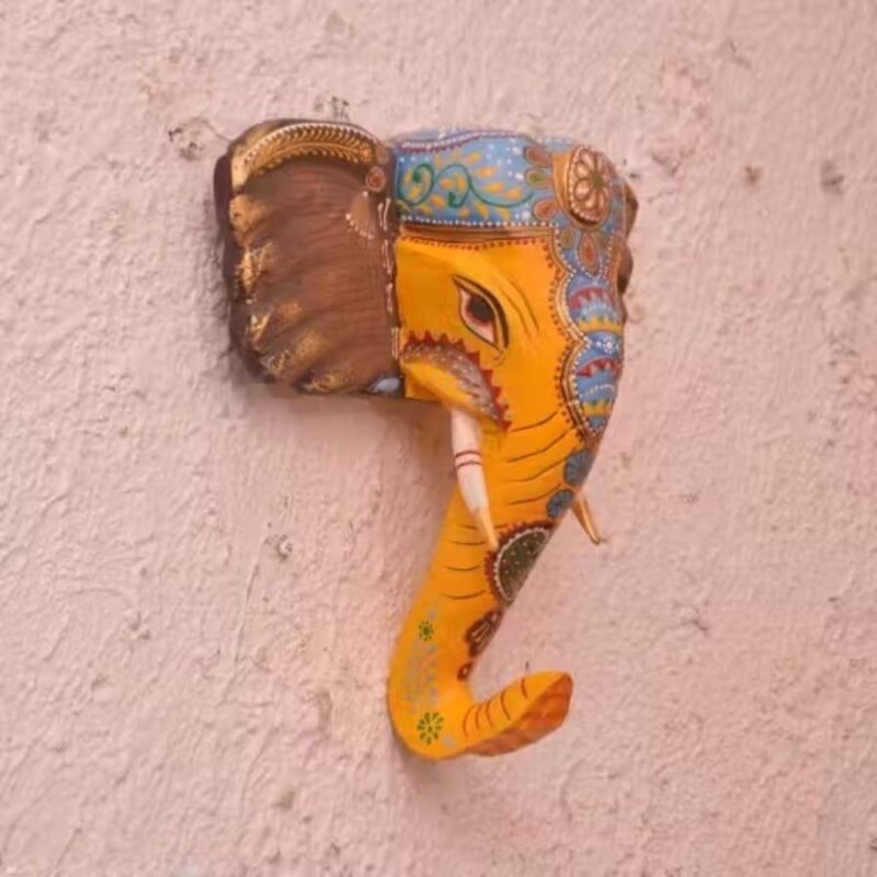 - Handcrafted Design: Intricately painted elephant face with yellow base, blue headscarf, and multicolored floral patterns