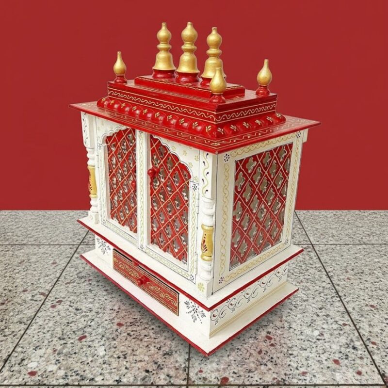 Handcrafted wooden pooja mandir in red and white finish with gold accents.
