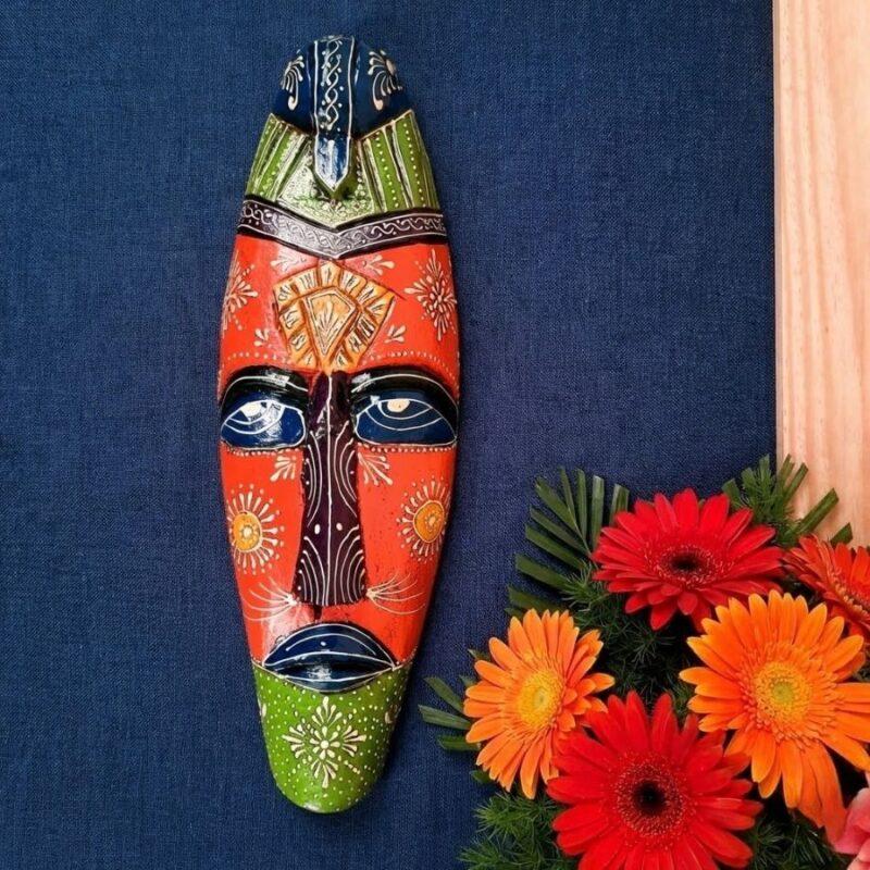 Handcrafted Design (For Orange Variation): Intricately painted wooden mask with vibrant multicolors—Orange base, green edges, blue accents, and golden details—for authentic tribal appeal.