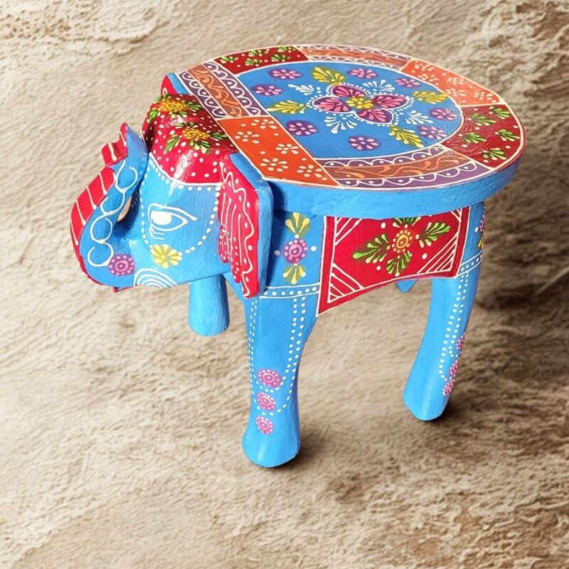 Furnshine – Sky Blue Design Wooden Elephant Stool – Indian Handicraft Home Decor, Pooja & Foyer (8″H x 10.5″L x 8″W)