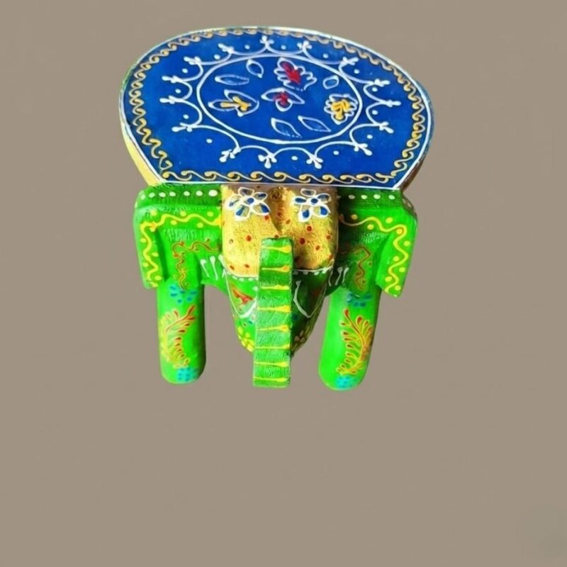 Furnshine – Wooden Elephant Stool Green Blue Design 6H x 9L x 6.5W Inches – Indian Handicrafts Home Pooja Foyer Decor