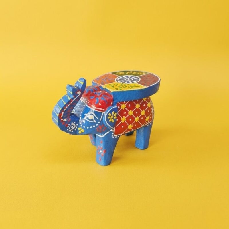 Furnshine – Cute Small Wooden Elephant Stool Blue Multicolor Hand-Painted – 4″H Indian Handicraft Home Decor Return Gift