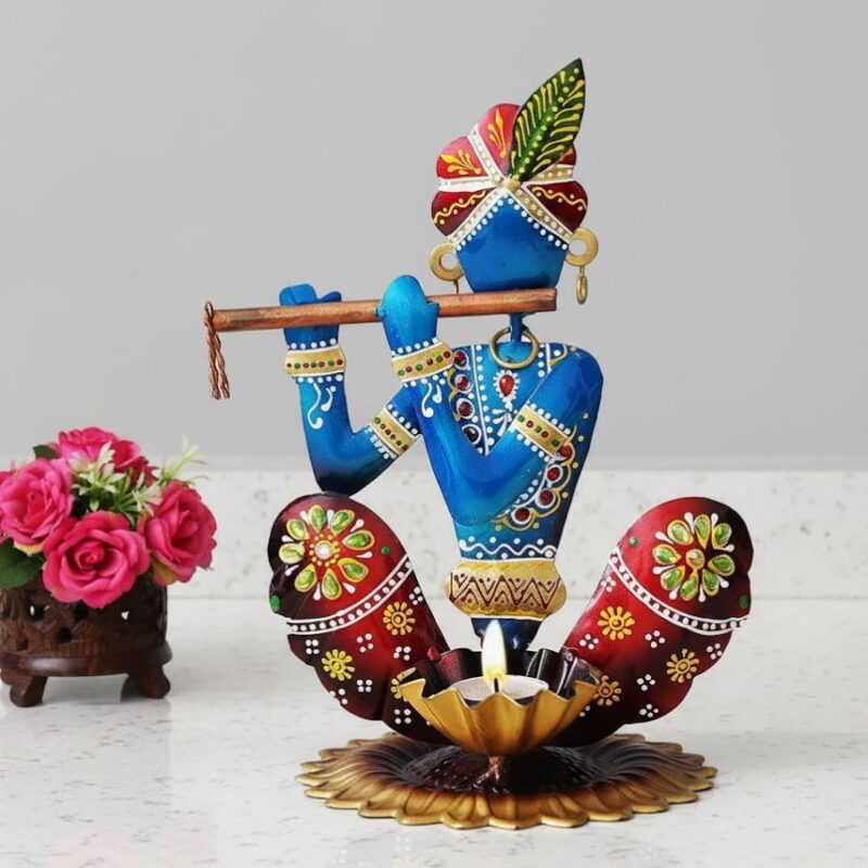 Furnshine – Lee Metal Krishna Tea Light with Bansuri Showpiece for Home Decor, Elegant Lord Krishna Tea Light Holder, Home Decoration Gift for Living Room
