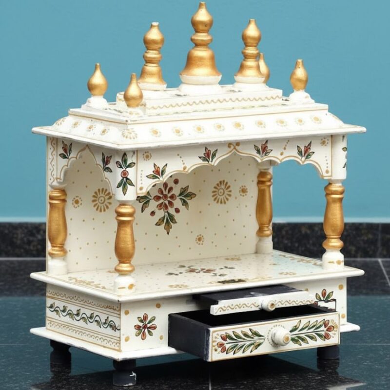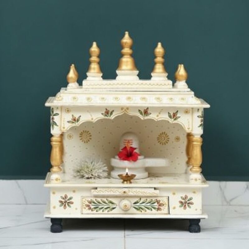 Furnshine – Handcrafted Wooden Pooja Mandir for Home | White Rajasthani Temple with Hand-Painted Floral Design, Kalash Dome & Storage Drawer