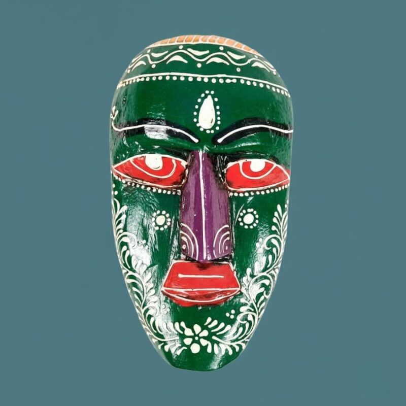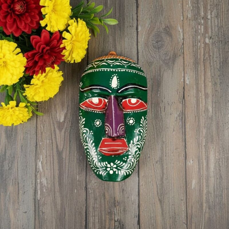 Furnshine – Handcrafted Green Wooden Tribal Wall Mask – Nazar Battu for Home Entrance, Living Room & Ethnic Decor – 9 Inch Hand Painted Hanging Art