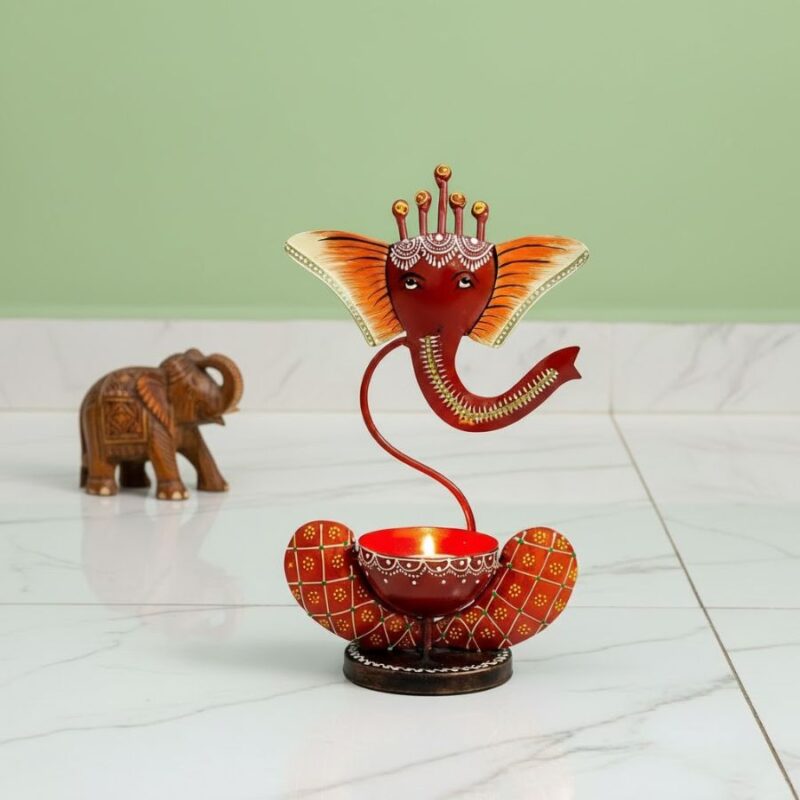 Furnshine – Presley Ganpati T light Holder for Home Decor – Festive Hand Painted Candle Stand (Red & Orange)