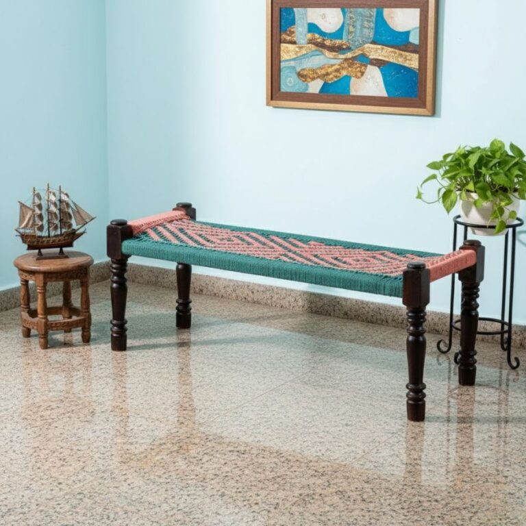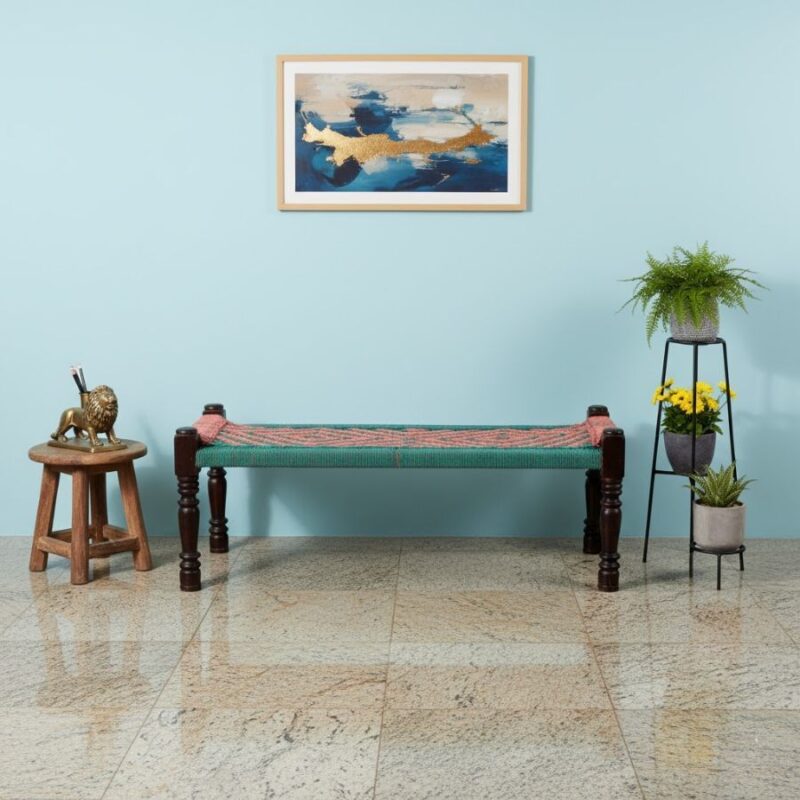 Funrshine – Ansley Handwoven Sheesham Wood Bench (Green & White)