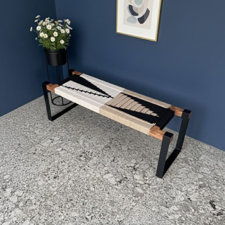 Furnshine – Aston Solid Wood Woven Bench with Black Metal Legs (Beige, White & Black)
