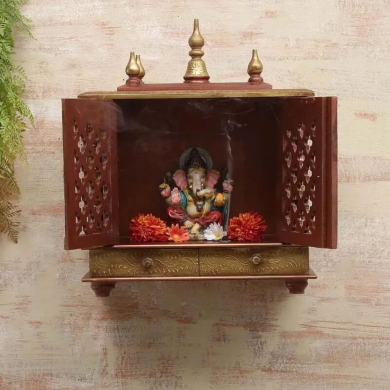 Furnshine – Wall Mounted Solid Wood Mandir for Home Pooja & Aarti – Rich Brown & Antique Gold Jaali Door Temple with Dual Drawers, Decorative Domes & Space-Saving Hanging Design for Living Room or Pooja Room Decor