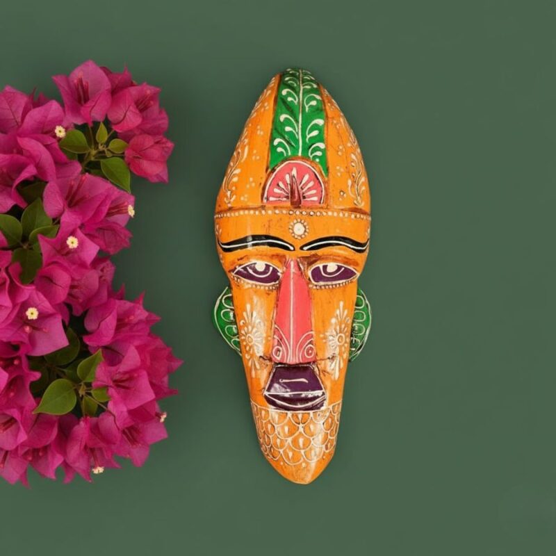 Furnshine – Handcrafted Orange Wooden Tribal Wall Mask with Green Accents – Nazar Battu for Home Entrance, Living Room & Balcony Decor – 12 Inch Ethnic Hanging Art