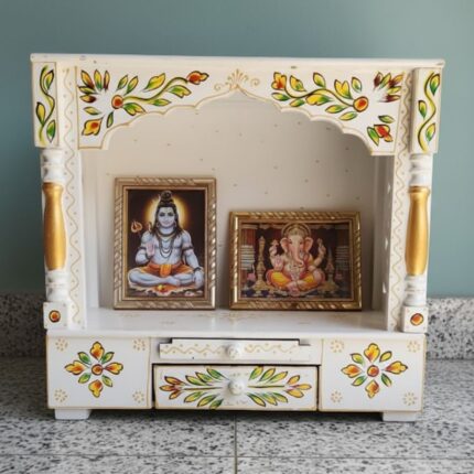 Furnshine – Handcrafted White-Green Rajasthani Wooden Pooja Mandir – Open Shelf Temple with Floral Drawer