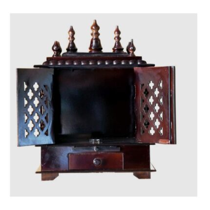 Furnshine – Handcrafted Solid Wood Home Temple with Drawer | Compact Dark Brown Finish Pooja Mandir for Home & Office | Jaali Door Design, Turned Pillars & Dome Top