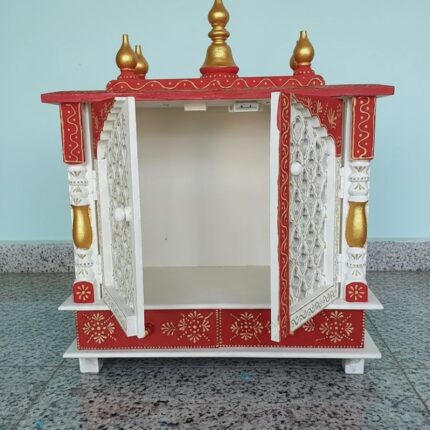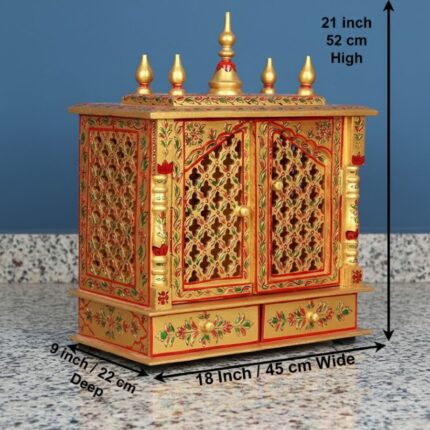Brand: Furn Shine Material: Solid Engineered Wood & MDF Color: Red base, Green-Yellow jaali doors, and floral carvings. Dimensions (in inch): 18L X 9.5B X 16H Storage Type: Drawer LED: No LED Theme: Religious Style: Antique Dome: No Idol Included: No Delivery Condition: Pre-assembled