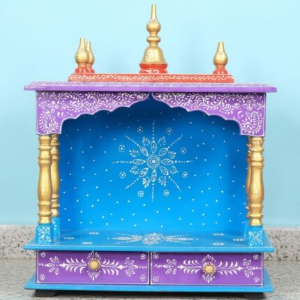 Furnshine – Handcrafted Wooden Temple for Home | Rajasthani Hand-Painted Pooja Mandir with Drawer | Blue & Purple Finish