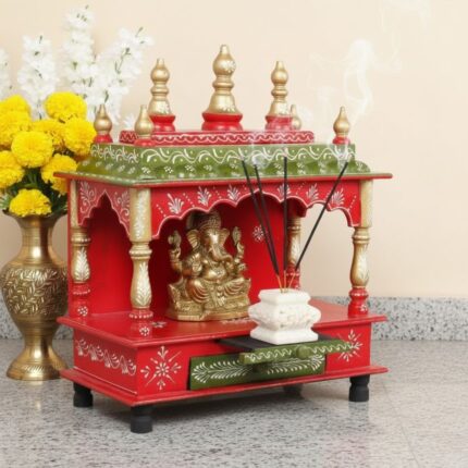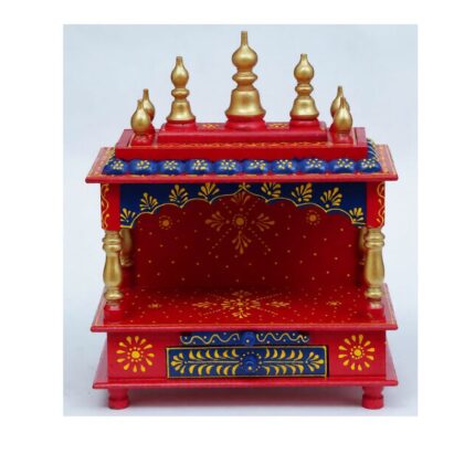 - Rajasthani hand-painted wooden home temple in red, white and green finish.