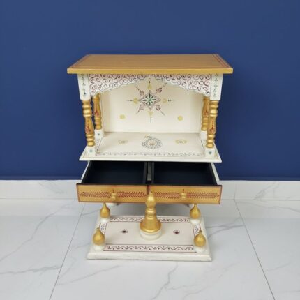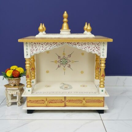 Handcrafted wooden home temple with white and golden finish for a royal look.