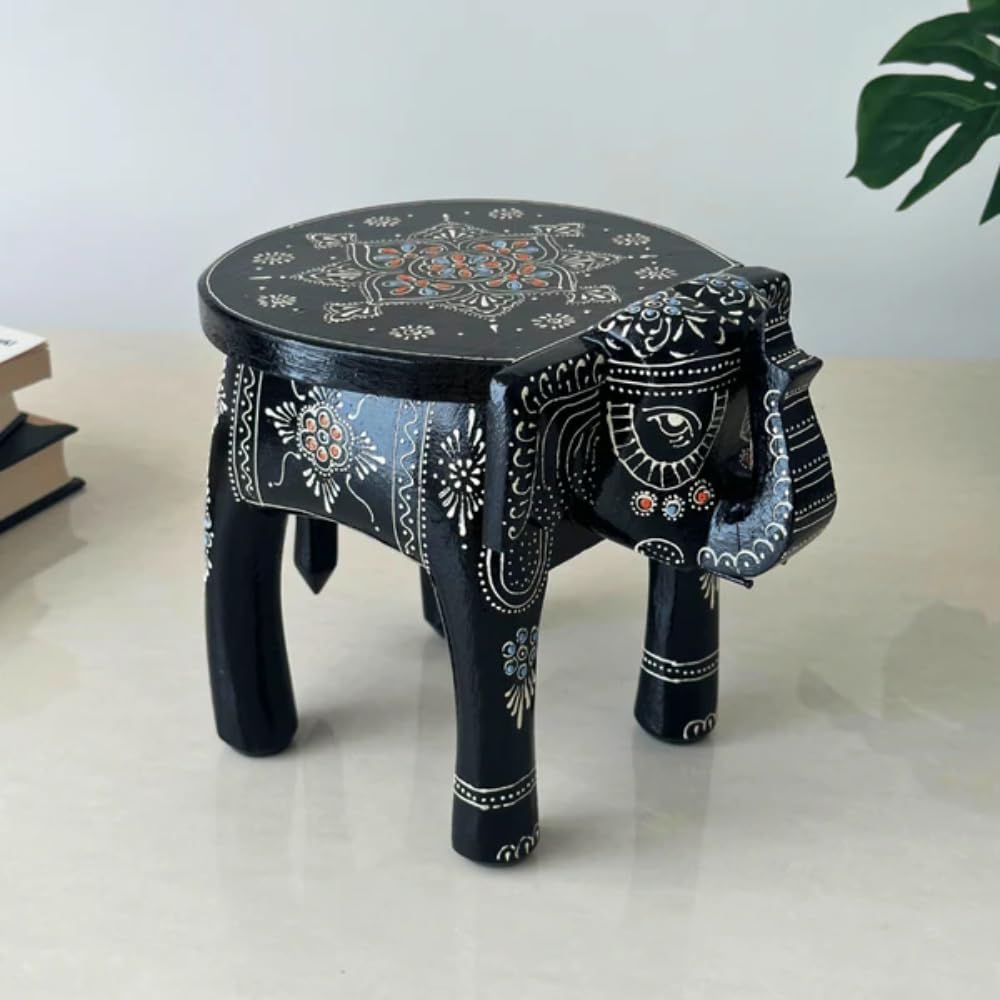 Furn Shine – Handcrafted Wooden Elephant Stool for Home Decoration – Black Compact Plant Stand, Small Side Table for Living Room, Bedroom, or Office, Modern Black Elephant Decor