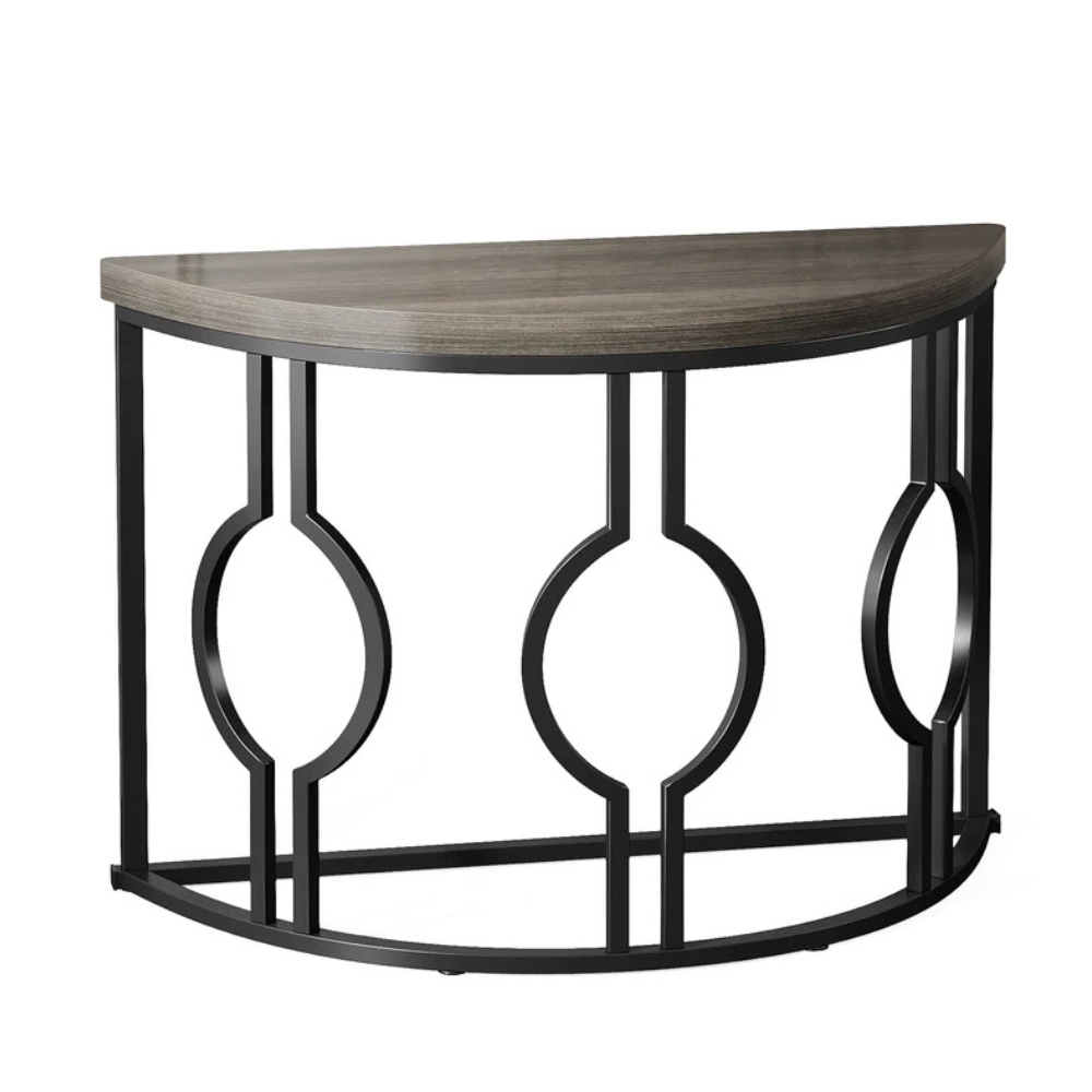 - SIMPLE YET TASTEFUL – A curved design with a dark distressed finish, while accented with chic geometric frames, this console entryway table exudes a retro industrial charm and provides bright accents for traditional to contemporary decors. A semi-circle table for entryway shows the master’s elegant taste in understated, your guests also will be captivated by it.