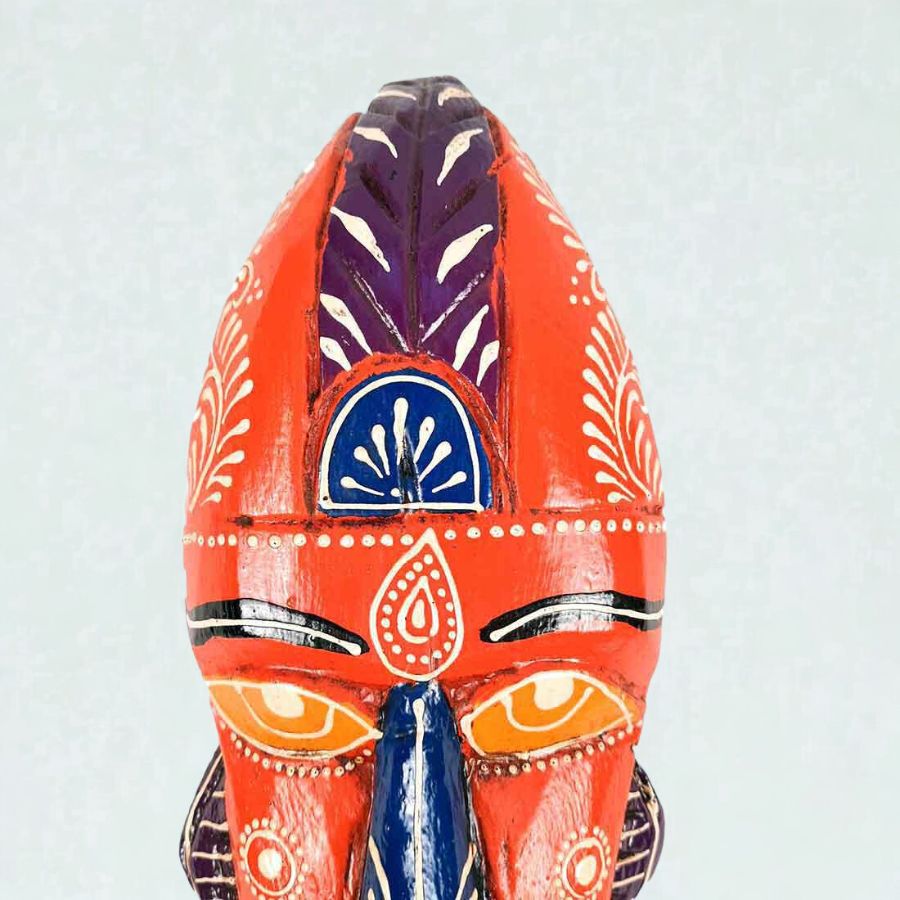 Transform your living spaces with this captivating 12-inch African Egyptian Tribal Wall Mask Nazar Battu, handcrafted from premium wood featuring intricate Cheriyal art details. Carefully carved from quality wood and hand-painted by skilled artisans, this mask features vivid orange, blue, and purple tones accented with intricate white detailing. This Afro-Egyptian inspired hanging blends ethnic, traditional, and contemporary aesthetics, serving as a powerful “Drishti Bomma” to ward off negative energies and invite positivity. Ideal for home entrances, living rooms, hallways, balconies, offices, or cafés, its lightweight 320g design ensures easy wooden mounting and versatile placement. The warm wooden tones create a rustic-modern charm, connecting you to cultural heritage while enhancing any decor theme. Perfect for housewarmings, weddings, or anniversaries, this mask elevates ambiance with symbolic protection and artistic allure. Care is simple—wipe with a dry cloth.