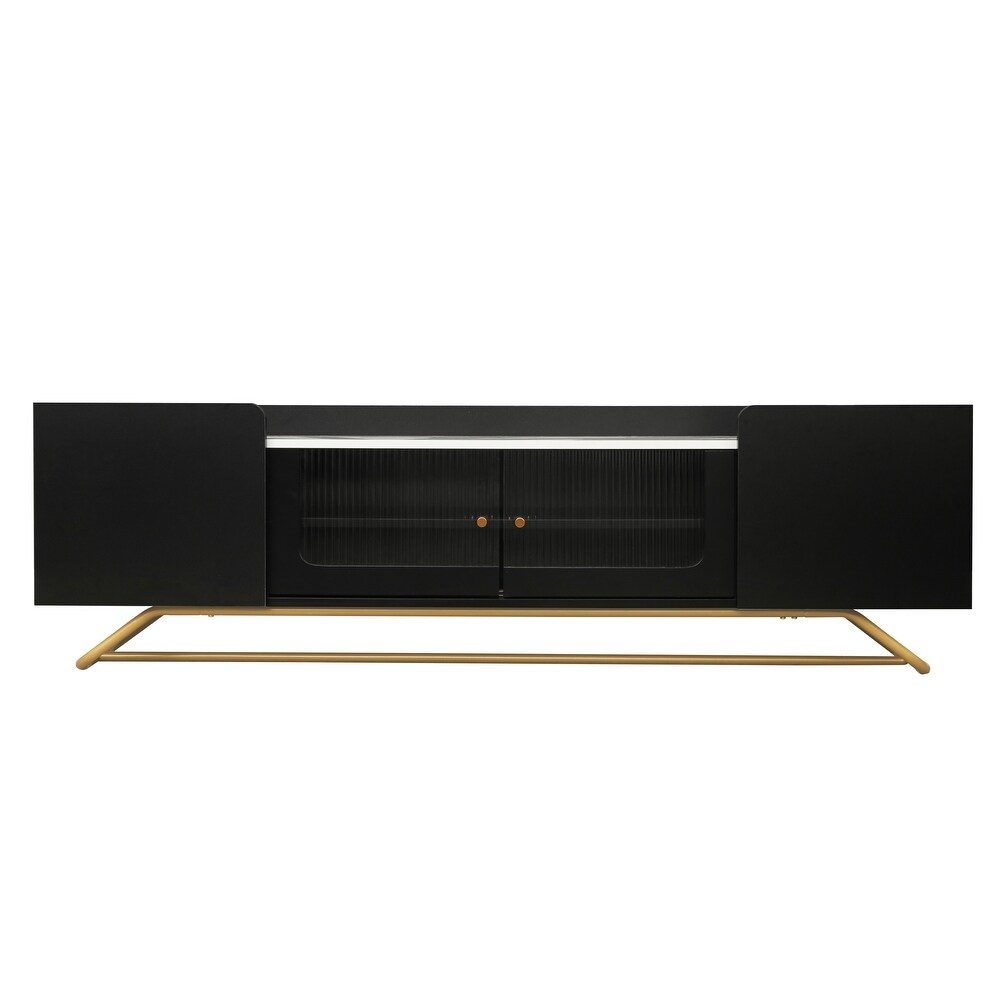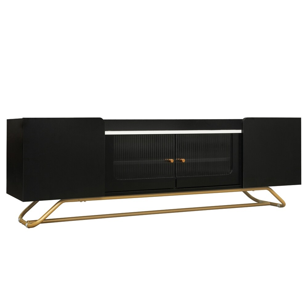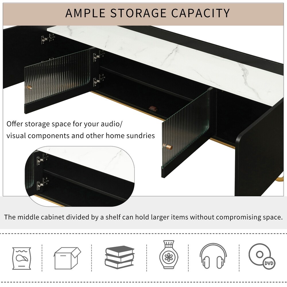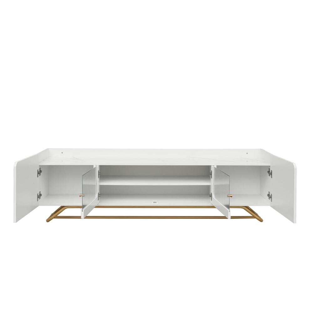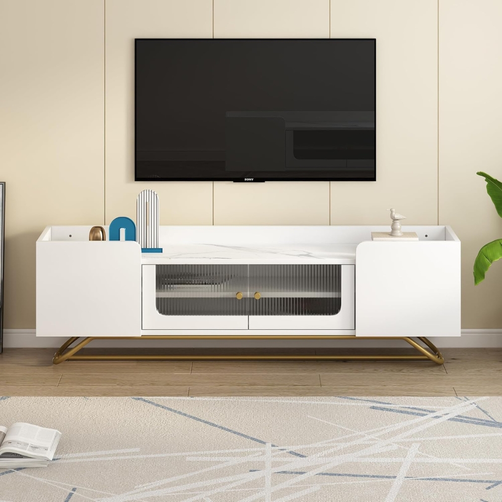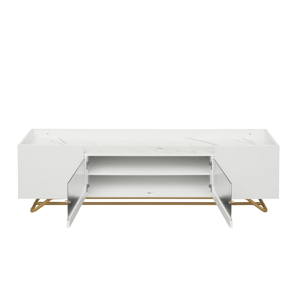 Raise the style bar in your living room with this dazzling TV stand featuring a faux‑marble top, luxurious enough to mimic natural stone without the upkeep. Supported by a sleek gold metal frame, it exudes modern sophistication. The fluted glass doors, centered in the piece, add refined texture and softly veil your media components, marrying privacy with visual interest. Behind glass, generous shelving keeps your AV gear, remotes, and décor beautifully organized. Crafted from durable particle‑board and MDF, it’s built to resist daily dings and stay flawless over time . Sized to fit TVs up to 70″ and able to support up to 110 lb on top, this stand combines practicality with elegance.