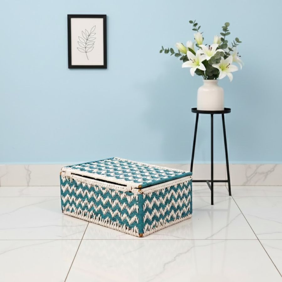 Organize your everyday essentials with this beautifully handcrafted blue and white woven storage basket. Designed with a sturdy frame and intricately braided pattern, it brings both elegance and functionality to any space. Perfect for desks, dressing tables, kids’ rooms, or living areas, this multipurpose box helps you store stationery, accessories, cosmetics, craft supplies and more. The hinged lid offers easy access while keeping contents dust-free. Lightweight yet durable, it adds a touch of artisanal charm to modern and traditional interiors alike. A perfect blend of style, utility, and craftsmanship for your home.