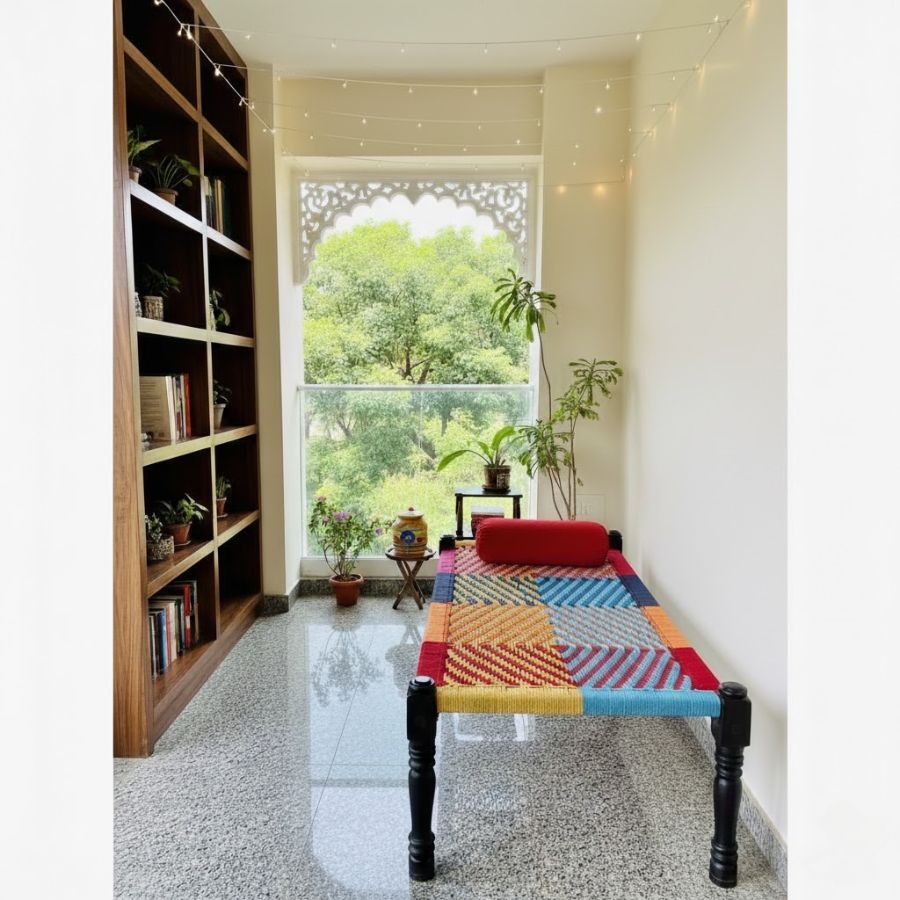 This Barton Solid Sheesham Wood Handmade Woven Charpai/Khatiya (Multicolor) from Furnshine is a vibrant, handwoven piece crafted from sturdy Sheesham wood and premium cotton rope. Its eye-catching patchwork of colors adds a lively touch to patios, balconies, or indoor lounges. Combining traditional weaving with a modern aesthetic, this charpai/Khaat is lightweight, easy to move, and ideal for both relaxation and social gatherings. Designed for durability, it blends handmade charm with comfort, making it a functional statement piece for any contemporary or ethnic decor setting.