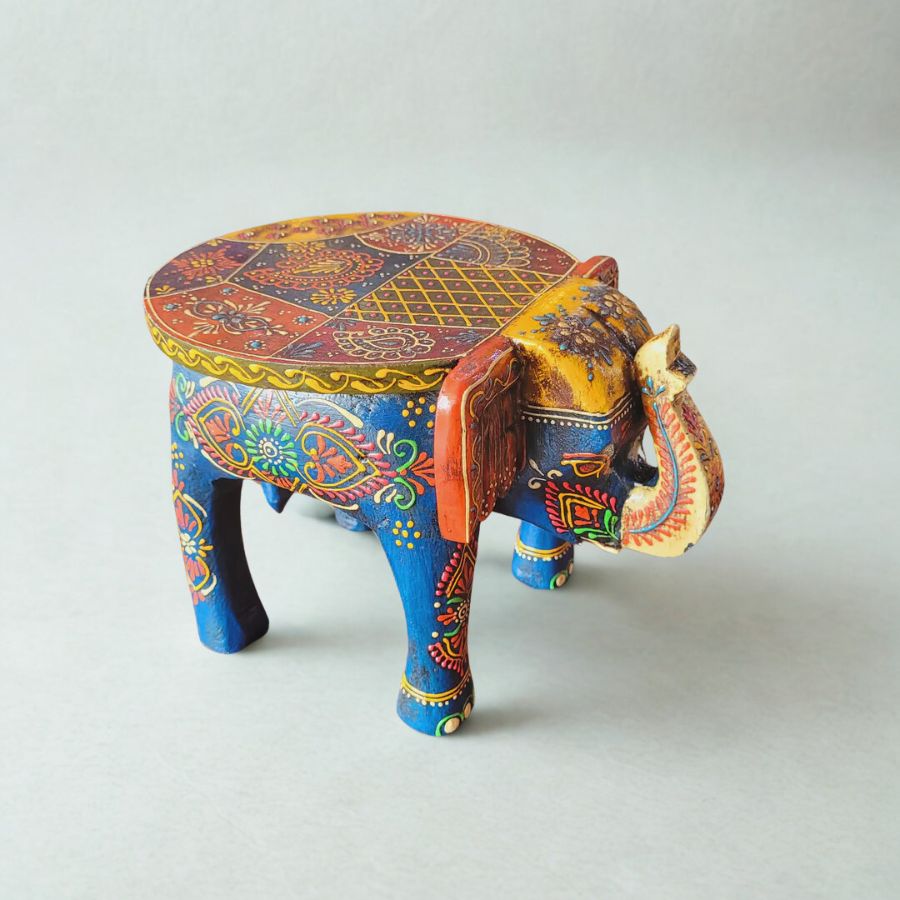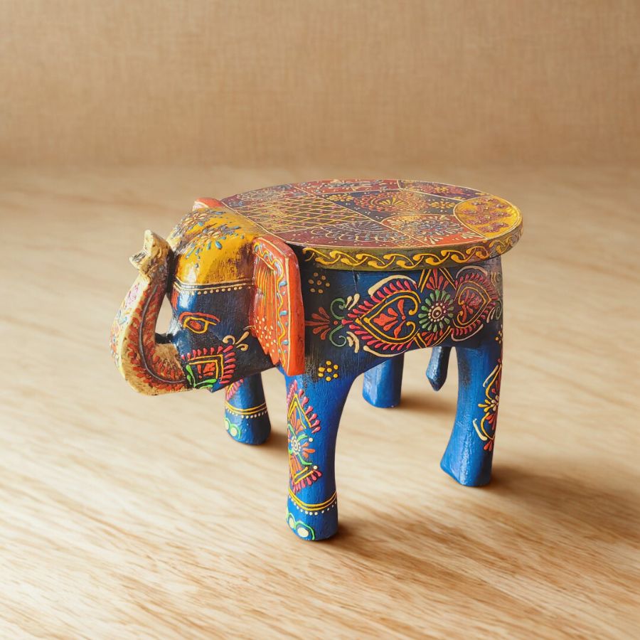 Handcrafted Elephant Stool embodies vibrant Rajasthani folk artistry perfect for pooja and home accents. This robust Indian handicraft, sculpted from solid wood into a majestic elephant form, measures 8 inches high, 10.5 inches long, and 8 inches wide, featuring intricate hand-painted floral vines in rich multicolored patterns.