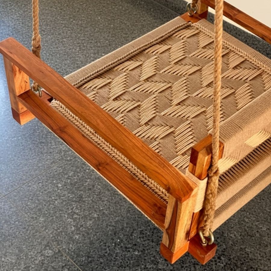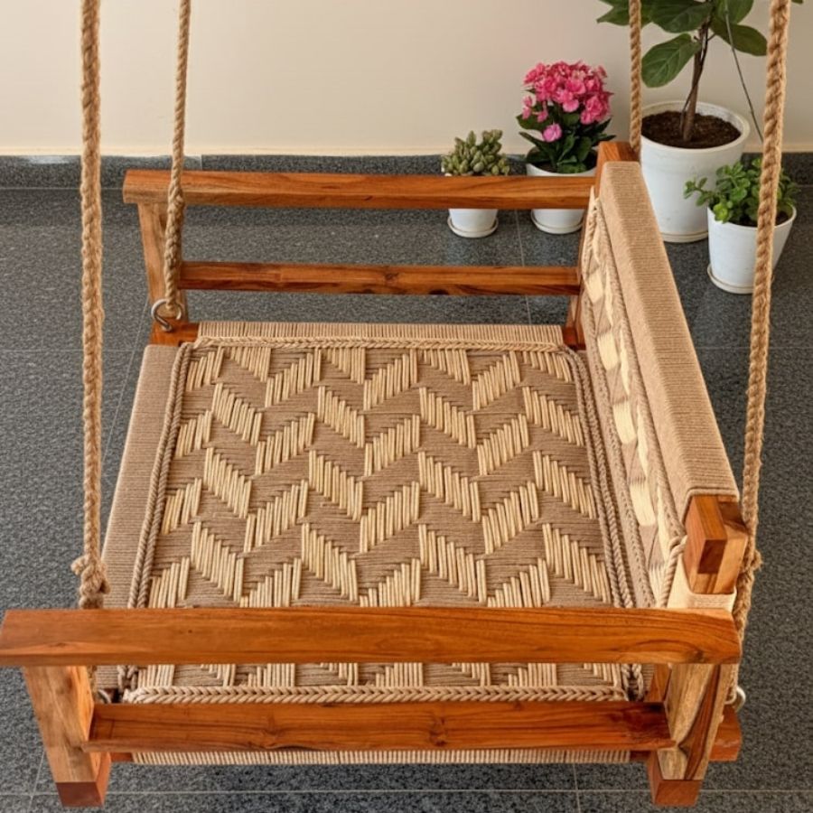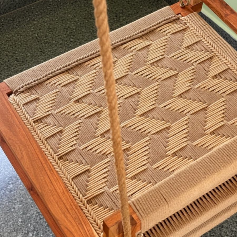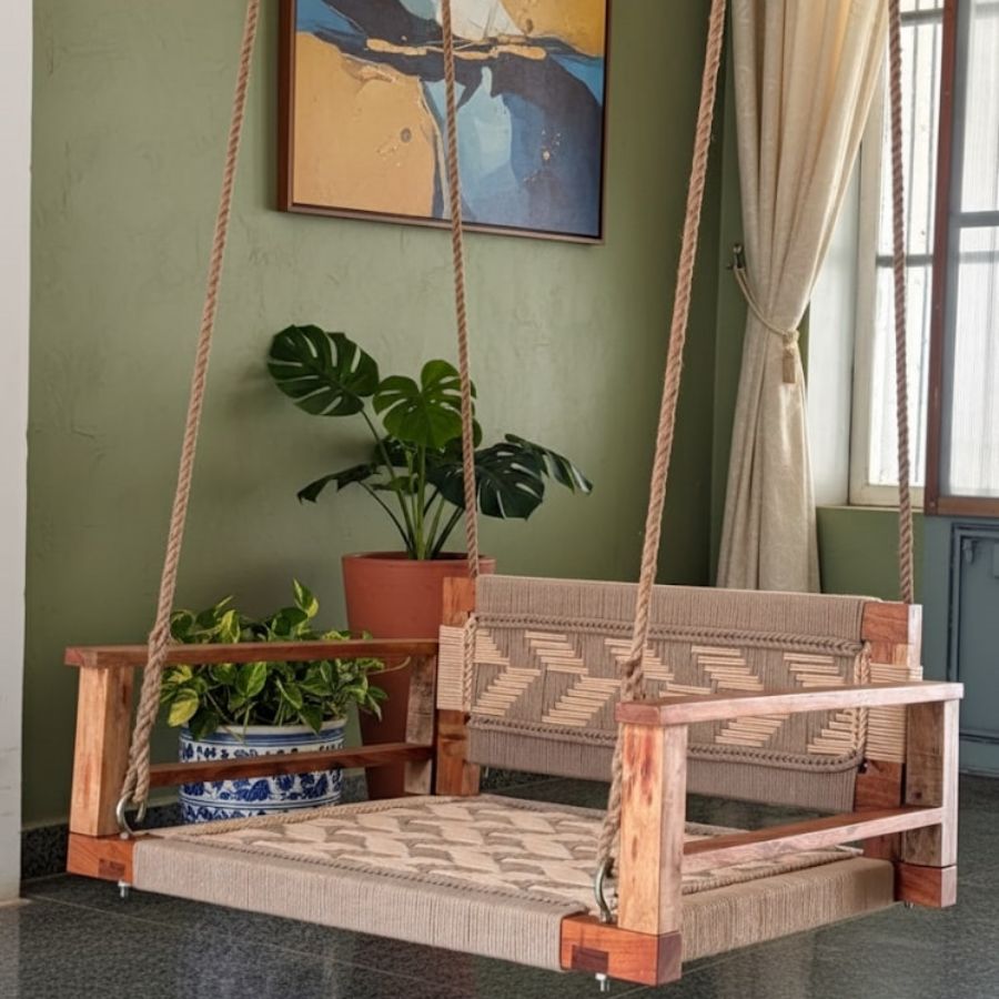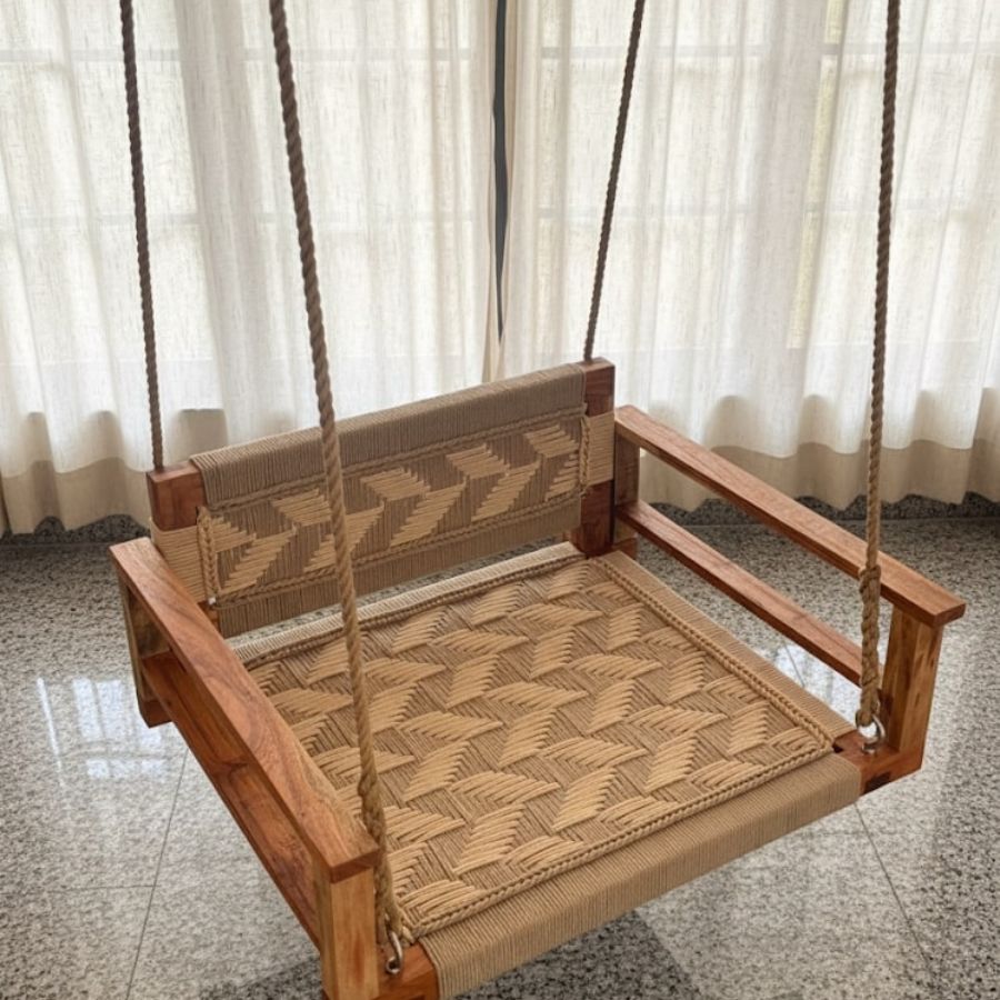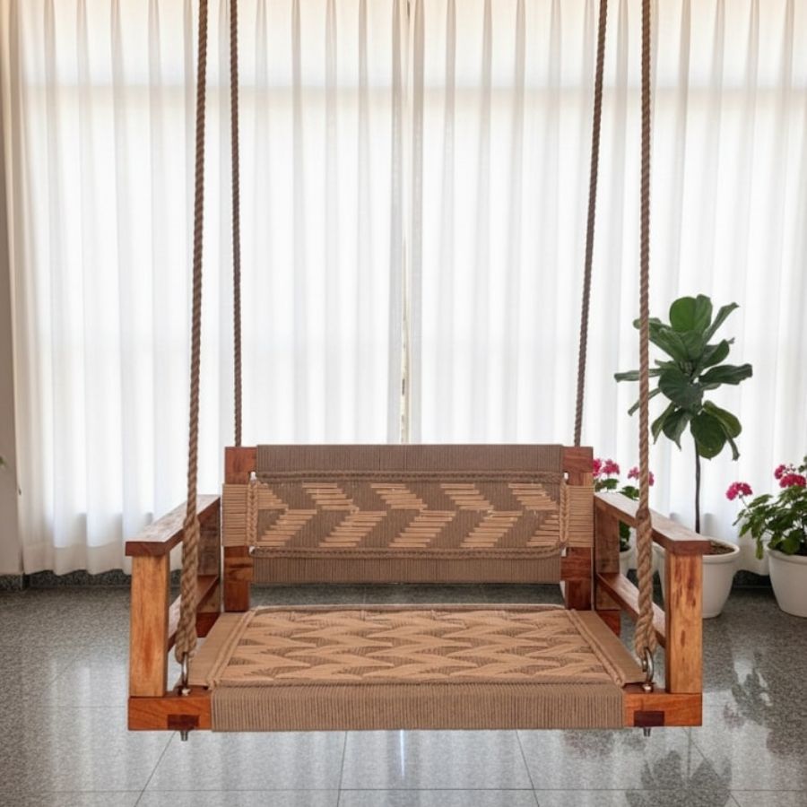 This premium Bradley Single Seater Armrest & Backrest Swing (Beige & Light Brown Pattern) blends timeless design with comfort, making it ideal for both indoor and outdoor settings. Handcrafted from sustainably sourced Acacia wood and woven with robust, eco-friendly hemp rope, its sturdy build supports up to 150 kg, ensuring relaxation and durability for any age group. The elegant natural hues and chevron woven pattern enhance any décor, while the armrest and backrest provide ergonomic support. This swing is perfect for creating a cozy reading nook, lounge space, or peaceful retreat at home, adding a touch of artisanal charm and modern functionality to living areas, balconies, or gardens.