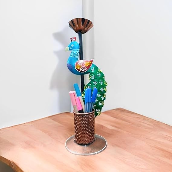 Elevate your workspace or home with this vibrant Chet Multicolor Iron Peacock Pen Stand & Tea Light Holder – Artistic Desk Organizer for Office, Study Table & Home Decor, designed to bring an artistic flair to your desk. Featuring a multicolor metal peacock perched on a durable metallic stand, this pen organizer keeps your stationery neatly arranged while adding a touch of Indian ethnic decor. Its intricate hand-painted details and rich colors make it an ideal gift and a standout accent for office desks, study tables, or living rooms. Perfect for lovers of functional art and unique home accessories.