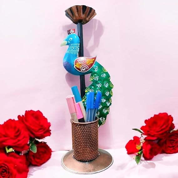 - Stylish Candle and Pen Holder with a Peacock Theme: A gorgeous peacock-patterned metal candle holder that is handcrafted and can be used as a chic pen stand for your desk.