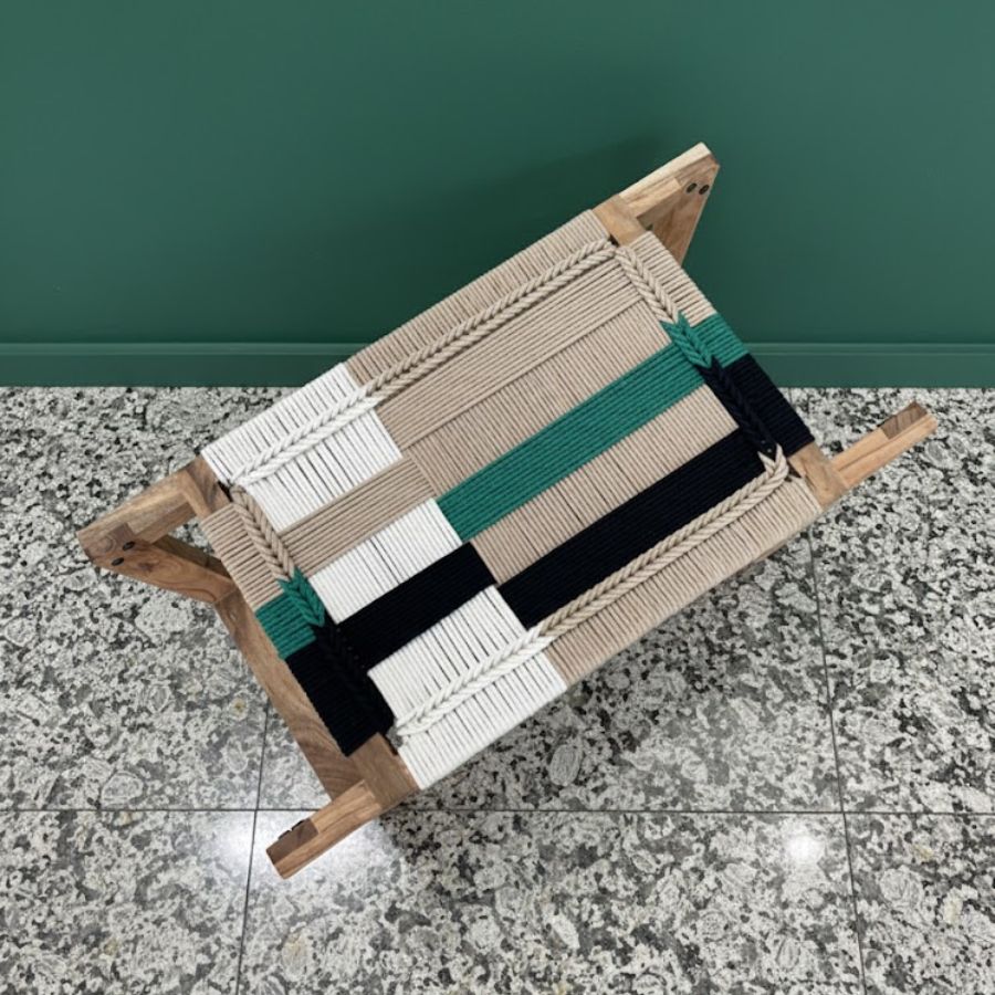 The Clifton Solid Wood Woven Stool (Beige, White, Green & Black) showcases a modern, woven design ideal for contemporary spaces. Handcrafted with well-treated solid wood and a 4 mm braided cotton cord seat in beige, white, green, and black, it delivers both style and durability. This versatile bench is perfect for bedrooms, living rooms, balconies, or gardens. Its compact form and lightweight construction make it easy to move, while the vibrant woven pattern adds a playful accent to any decor. Designed for lasting comfort and visual appeal, the Barun Stool suits both home and commercial interiors, blending function with artisanal character.